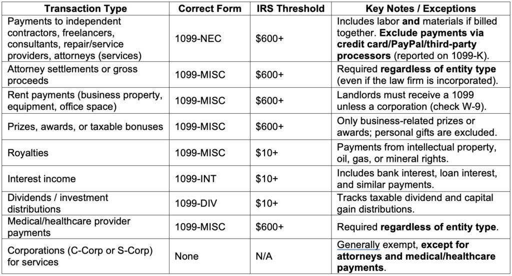 As we approach year-end, it is time to begin preparing your annual Form 1099 filings. Businesses are required to issue Form 1099 to any non-employee who performed services for your company and was paid $600 or more during the calendar year. This threshold includes both labor and materials when paid together on the same invoice.